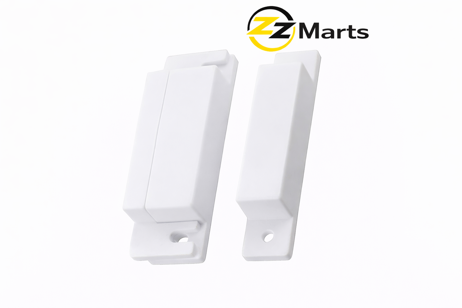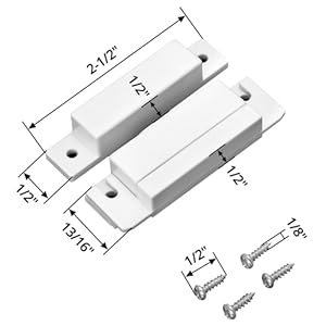 The device consists of two parts: a magnetic reed switch and a magnet. When the door opens and the magnet separates from the sensor, the circuit closes and can trigger an alarm or signal to the control panel.