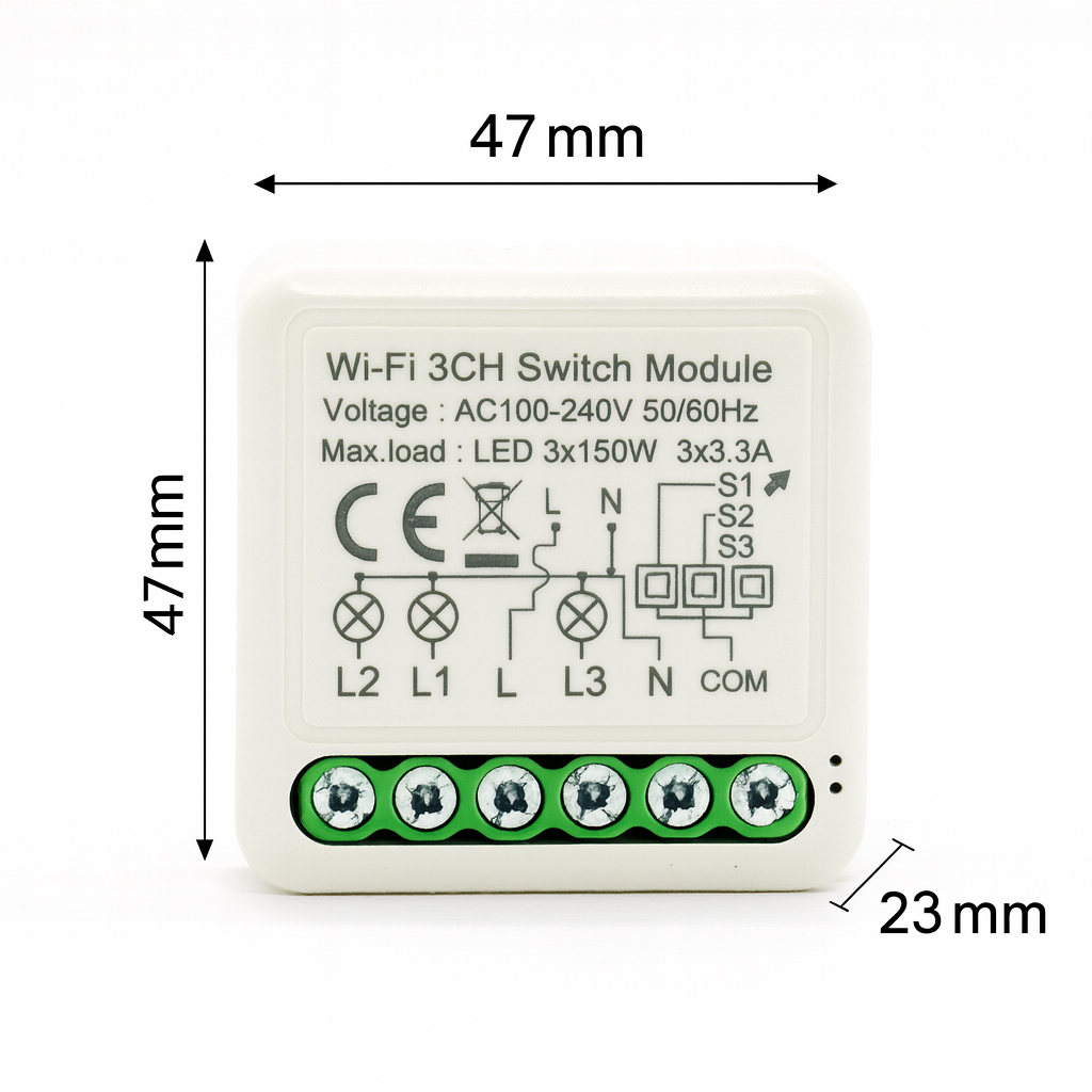 The Mini Smart WiFi Switch 3CH is a versatile smart automation device offering three independent control channels in a compact size. It is ideal for controlling multiple lights or appliances without altering the existing switch layout.