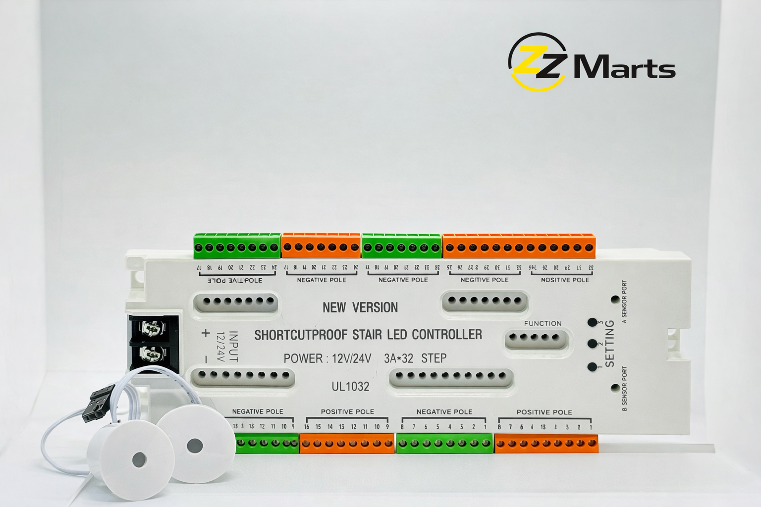 The Smart Stair LED Controller (32 Step) is designed to create a modern and visually stunning staircase lighting experience. It controls LED strips step-by-step, producing a smooth sequential lighting effect when motion is detected.